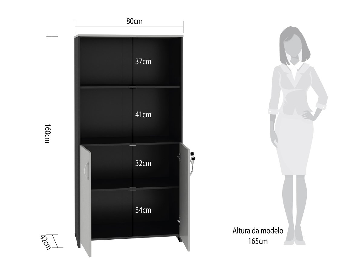 Tampo confeccionado em fibra de madeira aglomerada de média densidade (mdp) com 15 mm de espessura. Acabamento em ambas as faces, com laminado melamínico de baixa pressão (bp). O tampo é encabeçamento em todos os topos com fita borda pvc 1 mm. Corpo em mdp 15 mm de espessura, encabeçamento nos topos aparentes com fita borda pvc 0,45mm, Portas em mdp 15 mm de espessura, em todos os topos com fita borda pvc 0,45mm, todos revestidos com laminado melaminico de baixa pressão (bp) em ambas as faces. Fundo em Eucaplac 3mm revestido em uma face. Portas dotadas de dobradiças caneco 35 em aço estampado com abertura de 90°, contendo 04 dobradiças, 02 em cada portas, fechadura com travamento na porta direita e sendo travada a porta esquerda simultaneamente. Puxador alça em polipropileno injetado com acabamento em prata crome. Niveladoras de piso em polipropileno injetado e haste metálica com regulagem para o móvel. Composto por prateleiras internas, sendo 02 prateleiras móveis com possibilidade de regulagem e 01 prateleira fixa.