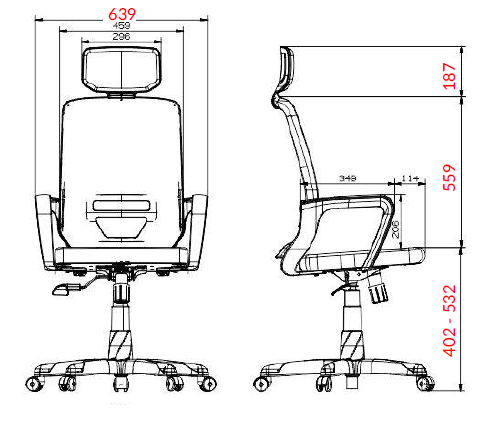 Base: Base giratória com aranha em forma pentagonal com 5 hastes de aço revestida com capa em nylon, apoiada sobre 5 rodízios duplo com 50 mm de diâmetro em PU (poliuretano) para uso em pisos nobres. Coluna central com sistema pneumático de regulagem da altura feita por alavanca e amortecimento de impacto da cadeira com mola a gás classe 4.